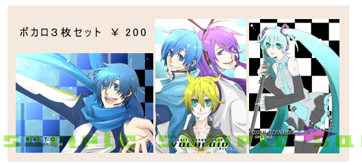 絵柄はカイト単体絵、カイト・レン・がくぽ3人絵、ミク絵です →サンプル